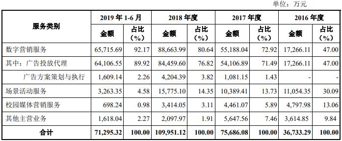从其具体业务分类情况来看,2016年-2019年上半年,三人行主营业务收入分别为3.67亿元、7.57亿元、11亿元及7.13亿元。其中,数字营销服务收入在报告期内快速增长,2016年至2018年三人行数字营销业务占营业收入的比重逐年提高,从2016年的46.81%上涨到2017年的72.77%,再至2018年的80.64%,2019年上半年更是高达92.17%。
