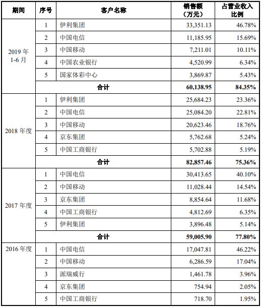 中国电信、中国移动为三人行报告期各期的前五大客户,伊利集团为2017年至2019年6月的前五大客户,京东集团、中国工商银行为2016年至2018年的前五大客户。