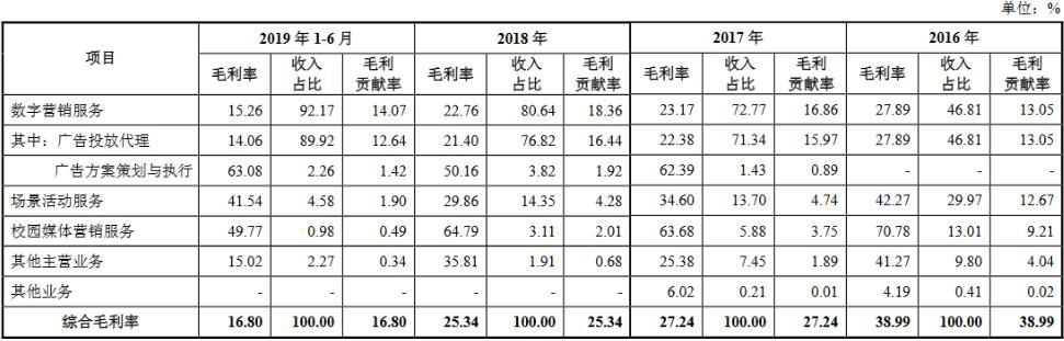 不过,在公司所有业务中,校园媒体营销服务的毛利率始终最高,2016年-2019年上半年分别达到70.78%、63.68%、64.79%、49.77%。