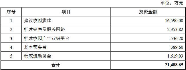 具体来看,校园媒体扩建项目主要包括建设校园媒体、扩建销售及服务网络、扩建校园广告营销平台等5部分,项目计划分3年实施完毕,合计投资2.15亿元,项目的投资资金将全部来源于募集资金。
