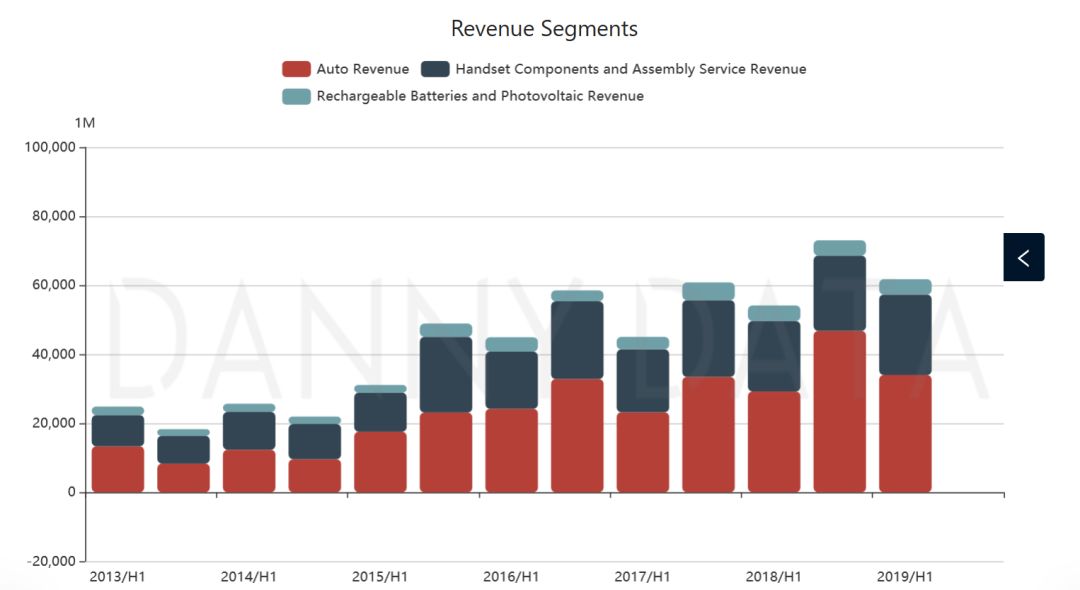 第一层面还包括了比亚迪的手机部件及组装服务,也就是你之前在DannyData看到的占比亚迪另一大头收入,比亚迪自1995年成立时的发家业务与此相关。