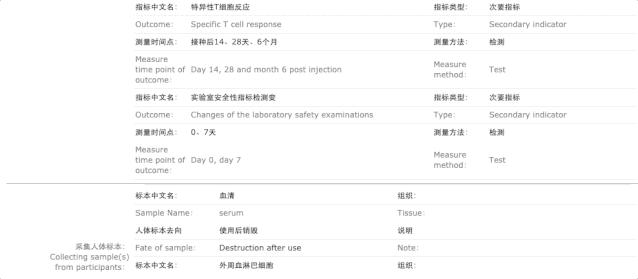 主要测量指标是在接种后7天的“0-7天内的不良反应”,次要指标是0-28天内的不良反应、6个月内的严重不良反应、抗S蛋白特异性抗体、抗SARS-CoV-2中和抗体、抗Ad5中和抗体、特异性T细胞反应、实验室安全性指标检测变等。