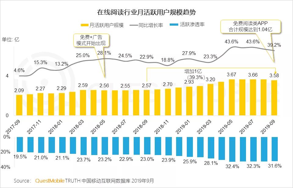 数字阅读是一个正在上升的市场。艾瑞咨询数据显示,2019年中国移动阅读市场规模达204.9亿元,同比增长22.4%。尽管在短视频、直播等娱乐类App的冲击下,移动阅读市场规模的增长率有所放缓,但仍然保持着稳定的上升趋势。另外,QuestMobile数据显示,2019年9月,在线阅读行业的月活跃用户规模已达3.58亿,同比增长39.2%;2018年9月至2019年9月,一年之内在线阅读行业的月活跃用户规模增加了约1亿。
