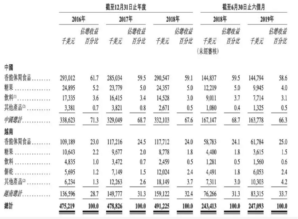 2019年上半年,上好佳在中国的营收为1.64亿美元,比去年同期的1.67亿美元出现了下滑。相反,越南市场2016年至2018年,反而营收从1.37亿美元增值1.59亿美元。
