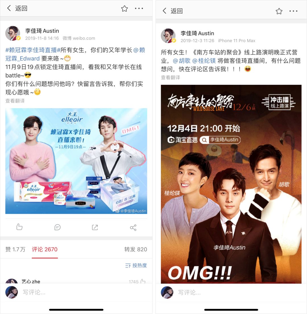 同时,越来越多的品牌、明星走进淘宝直播间。当红鲜肉周震南、赖冠霖等人走进了李佳琦直播间为品牌宣传,胡歌、桂纶镁到李佳琦直播间给电影做宣发......