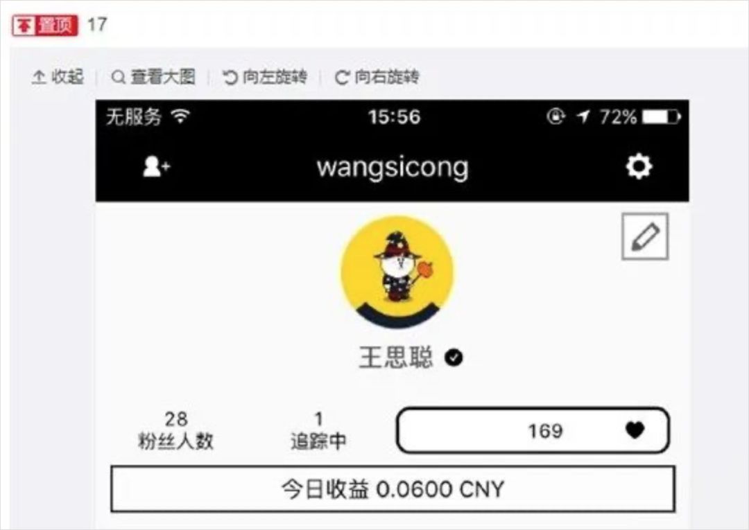 2015 年 9 月 26 日,王思聪突然置顶了一条配字“17”和自己的“17”App 主页截图的微博,帮自己投资的直播App 17 宣传。