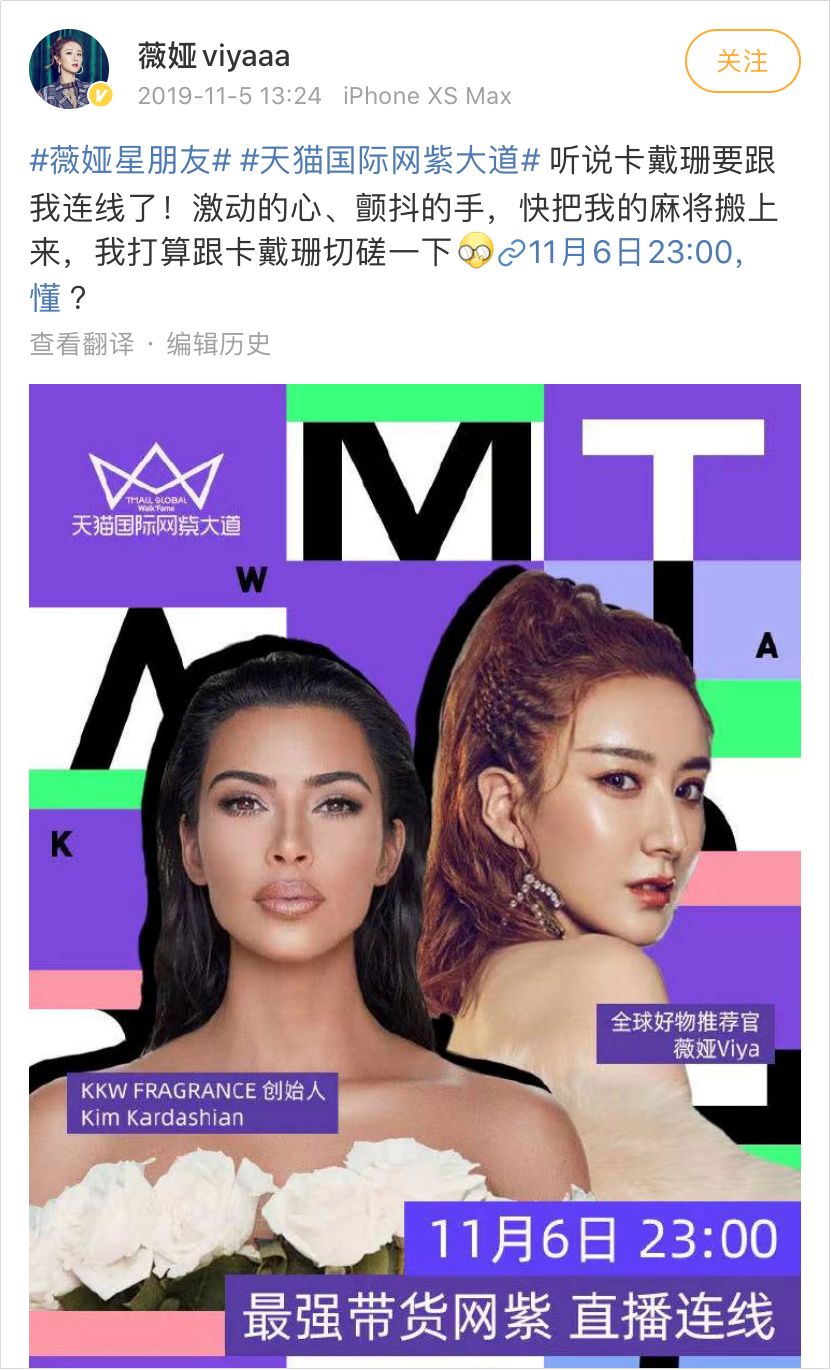 2019 年 11月 6 日,ins 网红卡戴珊还连线薇娅,成为首个“进入”淘宝直播间的海外明星网红。