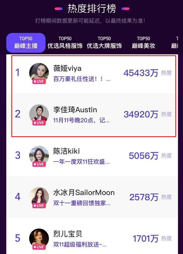 薇娅、李佳琦还是毫无悬念地位列主播榜首。