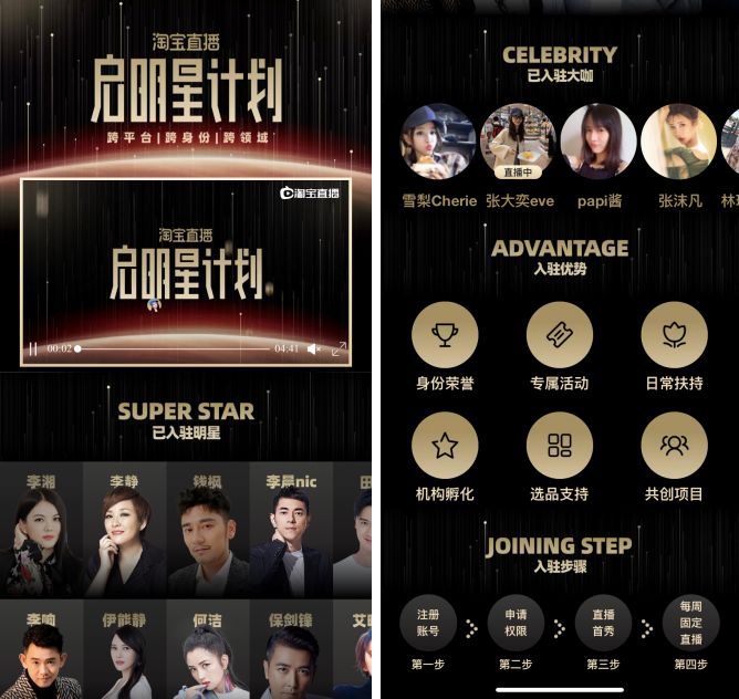 2019 年 3 月 30 日,淘宝直播启动了“启明星”计划,邀请站外的明星、KOL 入淘直播。