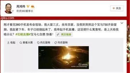 2015 年 8 月 25 日,360奇酷手机发布会结束后,周鸿祎的宝马730 突然自燃,但是他并没有灭火,而是举起手机做起了现场直播,给花椒导流。