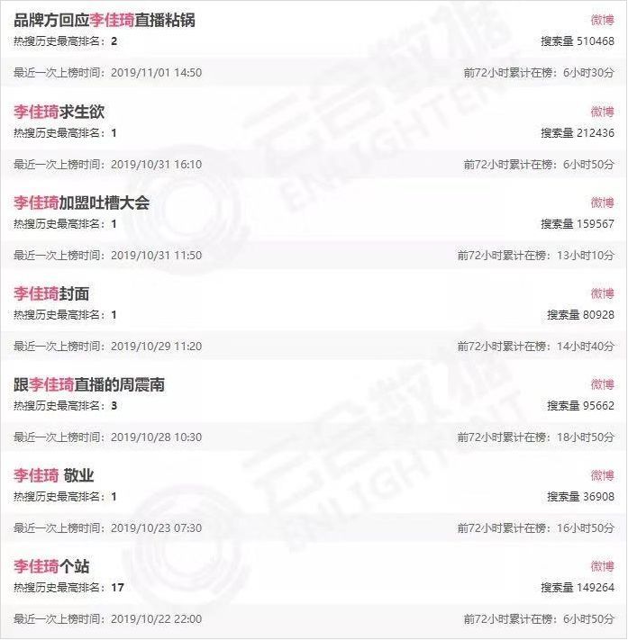 在双 11前夕,淘宝直播的关注度史无前例地高。从 10 月开始,微博热搜频繁被淘宝的主播们霸占,例如“李佳琦敬业"、“李湘卖貂”、“薇娅直播”等等。甚至,李佳琦从 22 号开始几乎天天上热搜,其中还有 4 次冲上热搜第一。