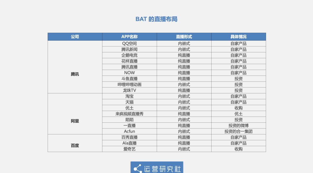 当然,聊到“千播大战”,BAT 也是不得不提的入局玩家,尤其是腾讯。在 2016 年腾讯合作伙伴大会上,副总裁殷宇透露,当时在 QQ 体系下,就有 4 个直播产品,包括空间直播、NOW直播、花样直播和企鹅电竞。