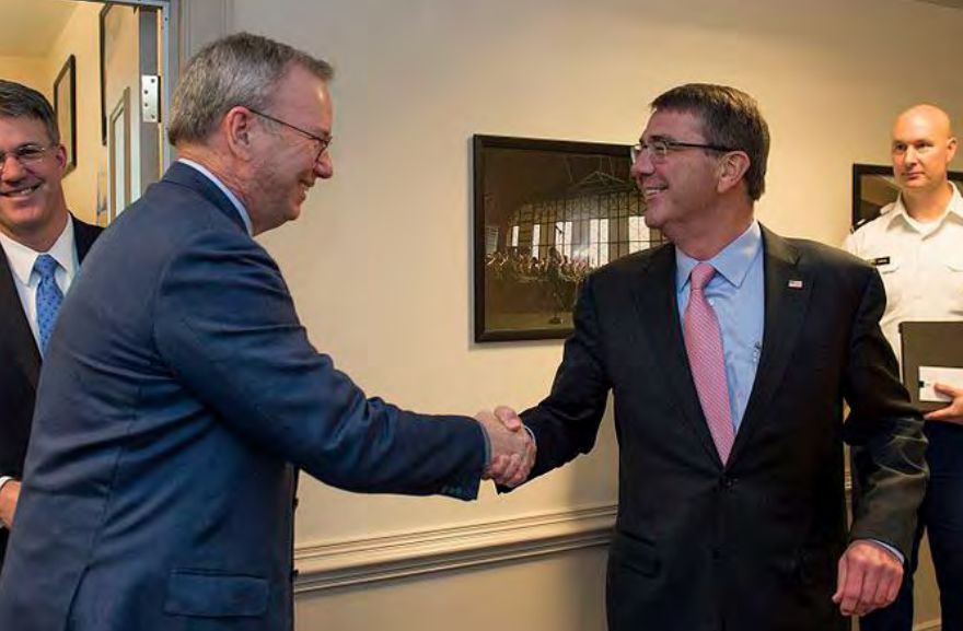 谷歌前 CEO 埃里克・施密特(左)与前国防部长阿什・卡特握手