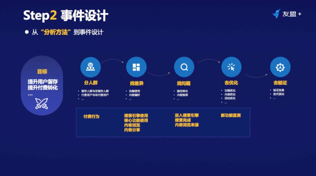 比如,目标锁定是要提升用户留存或者是提升付费转化率,那么,首先要找到不同的人群,针对人群找差异(功能使用、内容偏好的差异),找到不同的人群在功能使用、以及转化路径的差异后,在去找问题,如某一些功能对于非留存用户或者是非付费用户体验不好或推荐的内容用户不感兴趣,找到问题后,就需要进行优化,并进行验证;针对分析方法中的每个环节,其实都能对应到需要分析的事件,如找问题的环节会对入口的点击、完成的情况,内容浏览的来源等等进行事件采集,在分人群环节,会对用户的付费行为进行事件采集等等。