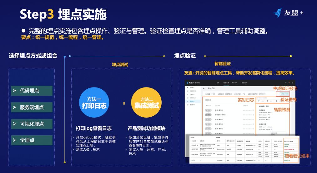 四、看板校验。埋点后可通过三种方式验证,一、打印日志,开启debug去打印Log,去验证触发事件log是否有上报,这种方式需要技术来配合验证。二、集成测试,以友盟+为例,只需要让技术注册一个测试设备,就可在你这个测试设备上去启用你的App,在去触发事件,产品、运营的同学就可直接测试埋点情况。三,也可以使用市场上智能验证的工具,以友盟+为例,可先注册设备,自动去识别整个埋点的情况,且日志是实时的,可产出事件的验证报告。
