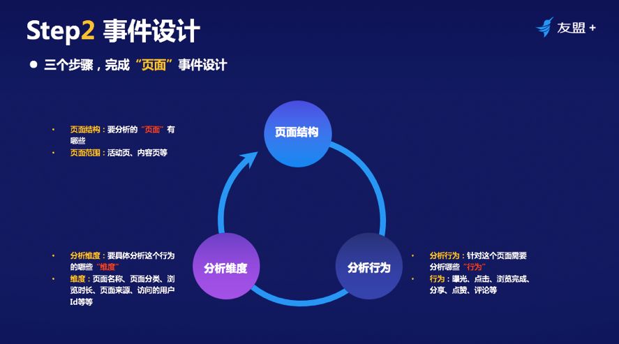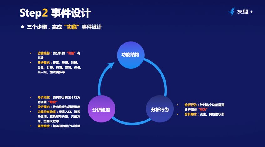 第二、事件设计。可以通过这3个步骤去完成事件的结构化设计,第一个步骤是要了解产品结构,也就是先要了解分析的范围是什么,例如需要知道对哪些页面或者哪些功能有分析需求;第二步,就是要针对这些锁定的范围,去明确我们要分析用户的行为有哪些;第三步,要把这些行为,落实到具体的分析维度上;