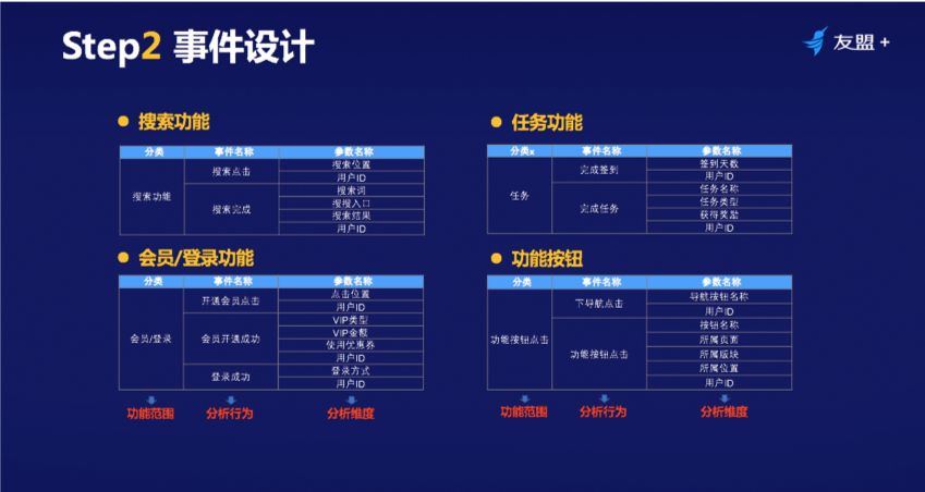 同样,第一步先找到要分析哪些功能。比如:搜索、登录、注册、会员、付费、签到等,第一步找到监测功能的范围。第二步在找行为,功能层面的行为比内容会稍微简单一些,主要是点击行为或者是完成状态。第三步是维度,例如:搜索功能,想分析搜索入口的点击情况,搜索的关键词是什么,针对登录与充值的话,需要分析帐号登录的类型、充值的方式等等。