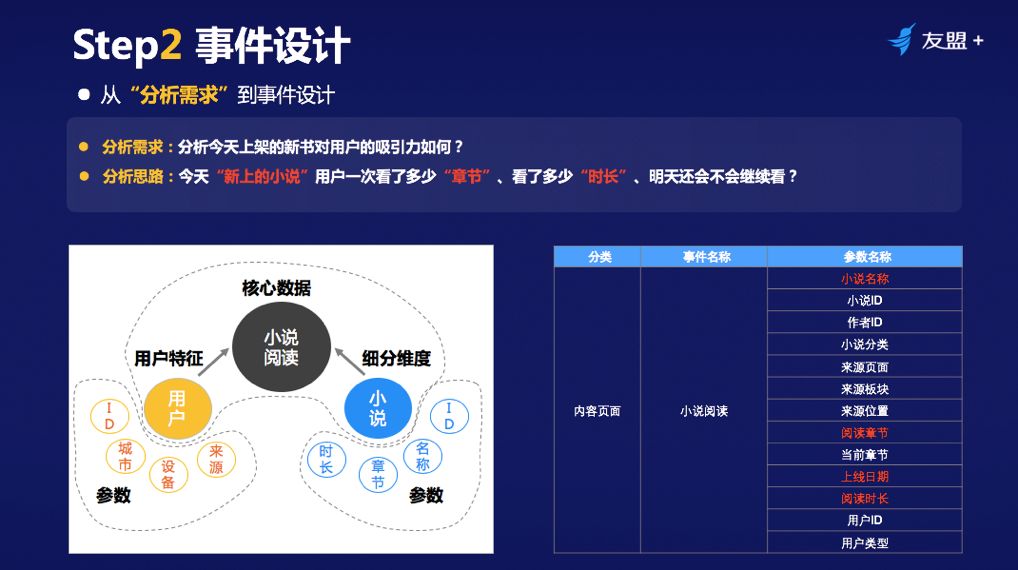 针对这个需求,分析思路是:今天新上架的小说,用户看了多少章节和时间,明天会不会继续来看,可以通过这几个维度去判断出新书吸引力。那么在落实到事件设计的三个步骤中,第一步采集的页面范围是小说页面,第二步采集的行为就是阅读,这两步对应出我们需要采集的事件就是小说阅读,第三步需要分析的维度就是阅读章节、阅读时长、小说名称以及上线日期,这些维度就可以转化成参数在事件中设计进来。