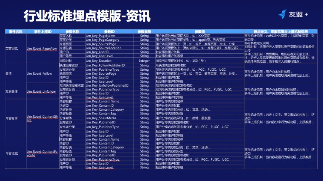 结构化事件设计完成后,下一步就是要交付给技术进行开发,下图为一个资讯行业的事件埋点模版,可以参照这个模板去进行梳理并提交给技术。友盟+开发者数据银行产品中的智能采集平台就可以按照这个模板,直接帮用户生成对应的埋点方案,并协助用户进行后续的事件管理。