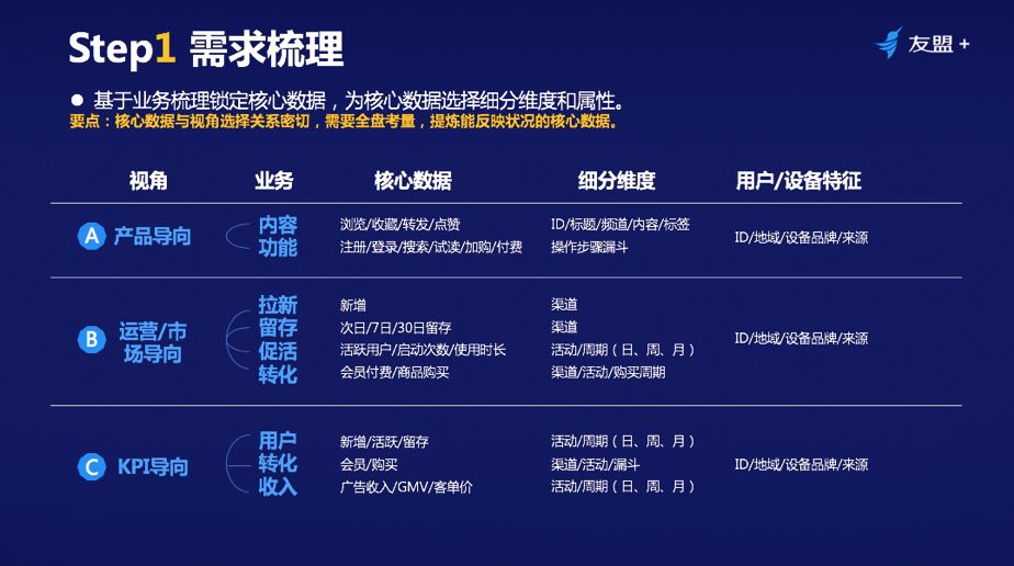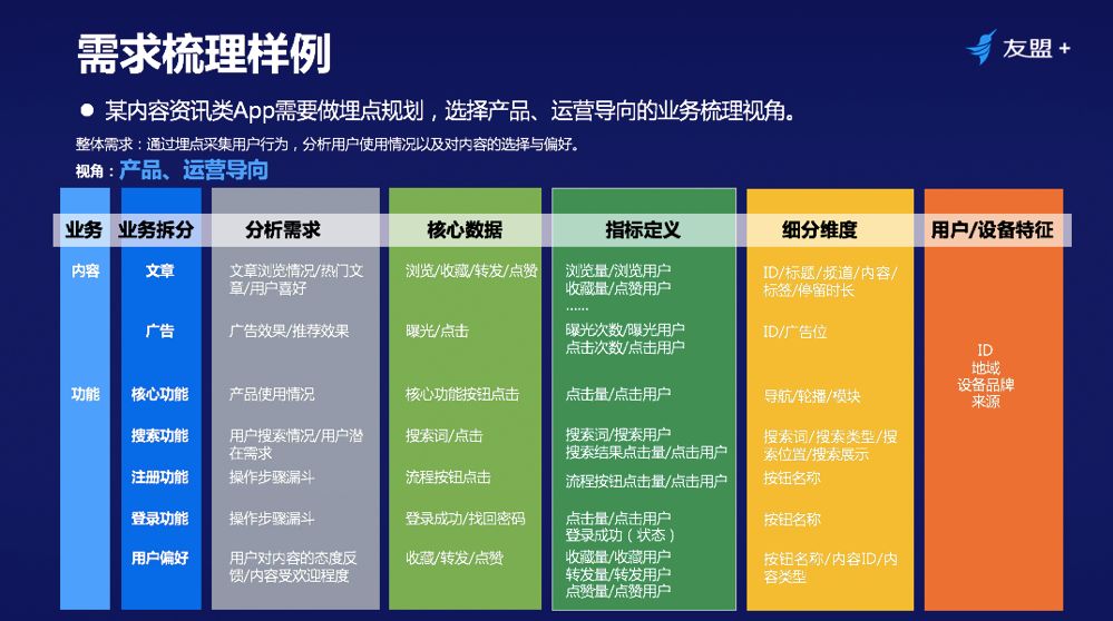 同时,会把不同视角的业务需求再转化成需要关注的核心数据,如产品运营在内容上所需要关注用户浏览、内容的转发或者是偏好,针对功能使用会关注注册、登录、搜索等这些功能的使用情况。