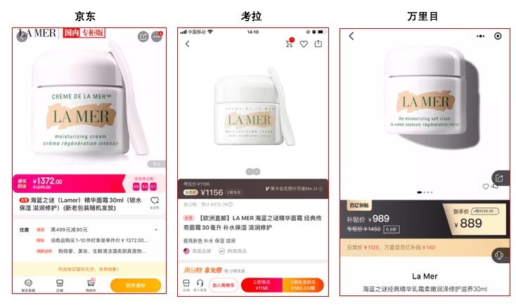 当前,万里目正在推出百亿补活动。异观财经在京东、考拉和万里行,对同一款海蓝之谜30ml精华面霜做了比较。其中,考拉自营会员价1156元人民币,京东自营1372元人民币,而万里目补贴价989元,到手价889元。