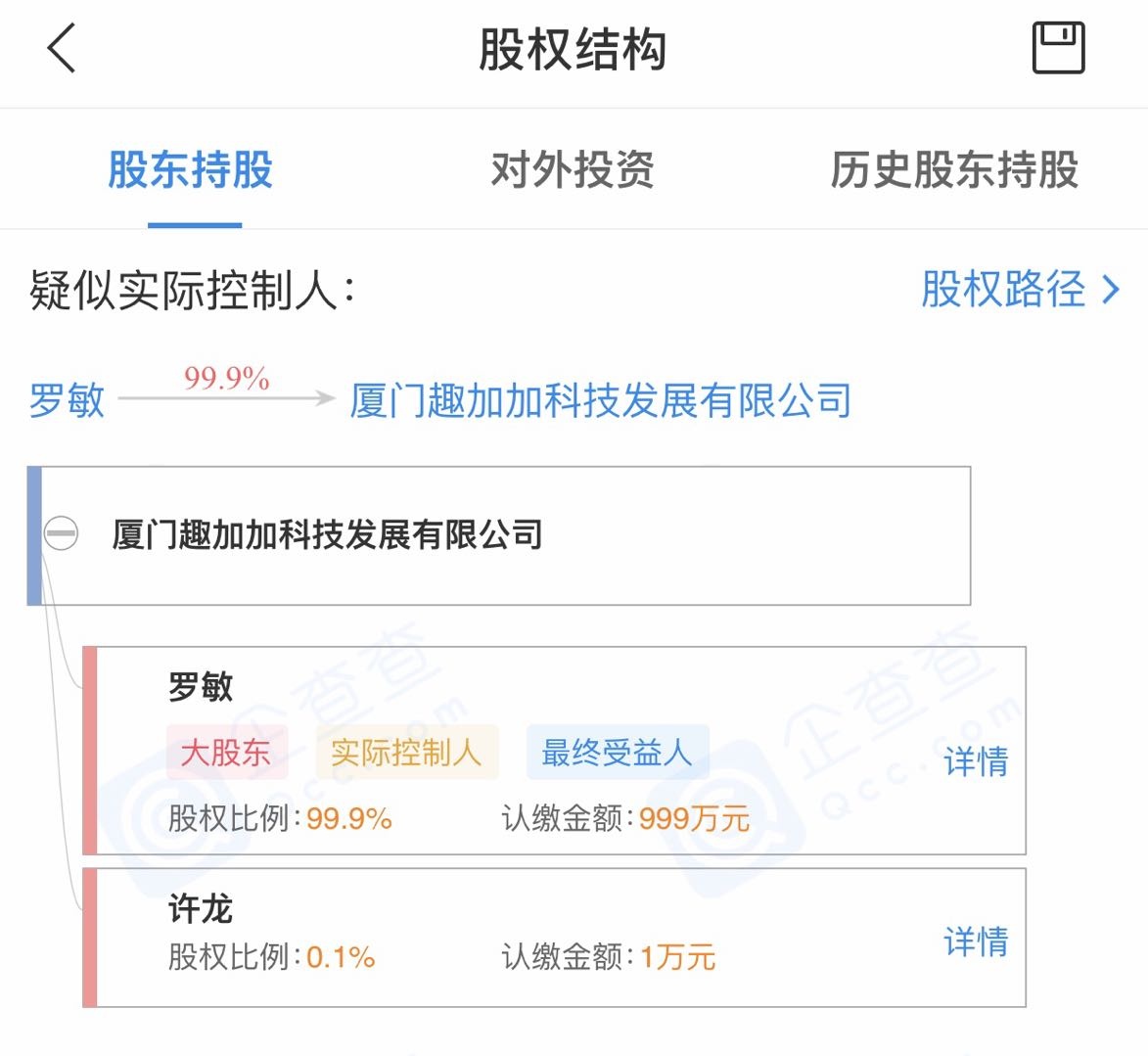 企查查显示,厦门趣加加科技发展有限公司成立于2019年6月5日,注册资本1000万元人民币,许龙是法定代表人,疑似实际控制人是罗敏,持股99.9%。