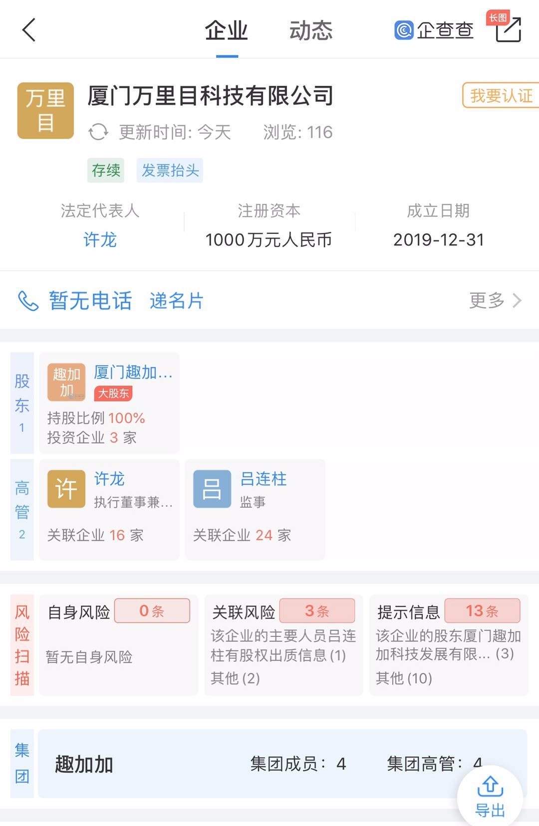 企查查显示,厦门万里目科技有限公司(下称“万里目”)成立于2019年12月31日,政策资本1000万元人民币,法定代表人许龙。透过股权结构发现,厦门趣加加科技发展有限公司是万里目大股东,持股100%。