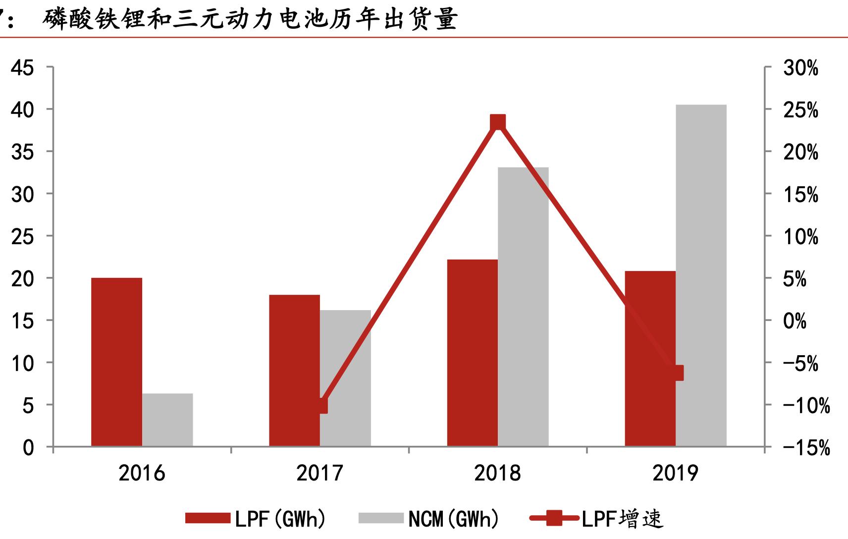 磷酸铁锂(LPF)和三元锂(NCM)历年出货量 来源:川财证劵