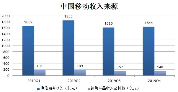 据财报数据,中国移动第四季度总营收为1792亿元(人民币,下同),同比增长5.97%,比彭博一致预期高55.3亿元。2019 年全年中国移动总营收为7459亿元,同比增长1.2%。其中,通信服务收入为 6744亿元,同比增长0.5%。