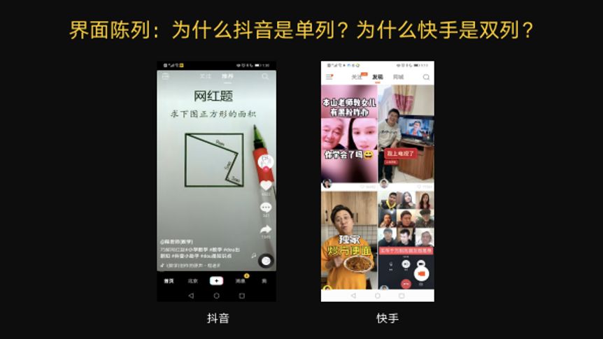 我们来看一个细节,抖音视频是单列陈列,一次只能看一个视频;快手是双列陈列,在主界面上能够看到好几个小视频。