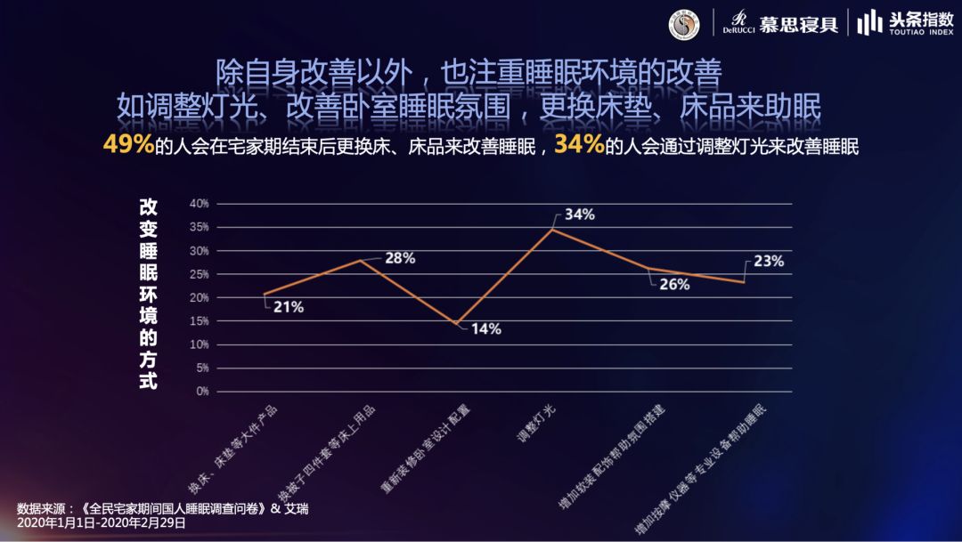 在改善睡眠环境方面,报告显示,49%的人会在宅家期结束后选择更换床、床品来改善睡眠质量,34%的人会通过调节灯光来改善睡眠。