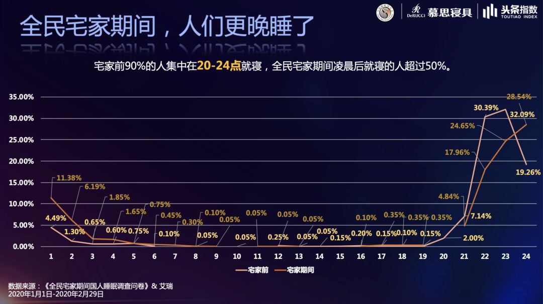 白皮书显示,全民宅家期间,睡眠超过8小时的人增长了20% ,睡眠10个小时人群增长最迅速,相比宅家前增加11.9%。由于疫情中,自我把控不受节制,大多数人的作息都没有规律。之前总是睡不够的觉,如今可以天天睡到自然醒,与此同时,伴随放纵的入睡时长的是推迟的就寝时间。