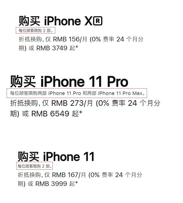 对于本次限购,苹果官网上给出了具体的说明,限购机型包括iPhone 11 Pro、iPhone 11 Pro Max、iPhone 11、iPhone XR、iPhone 8和iPhone 8 Plus在内的所有官网展示机型,都是每人限购2部,另外AirPods Pro也每人限购两部。
