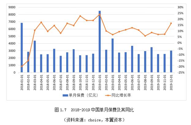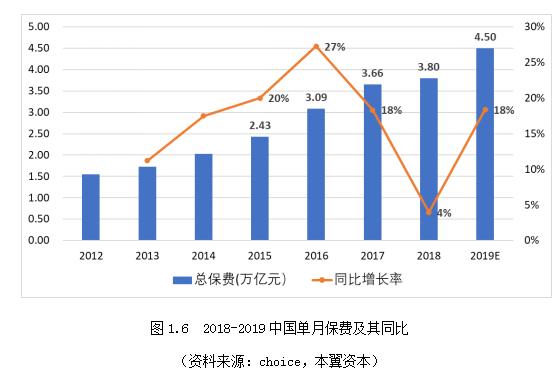 整体保费规模增速放缓,现有需求点难以持续支撑业绩增长,新的需求正在酝酿。2019年预计中国全年保费规模将达到4.5万亿,增长率重回18%的高位,主要是由于2018年在行业转型期出现了增速显著下滑。具体来看2018-2019年的单月保费增长情况,除了受监管影响出现负增长的1-2月,2018年其余月份保费增长率均高于2019年同月保费增长率,整体而言保费增速放缓,车险等个人财产险进入存量博弈,寿险向中长期保障型转型,企业财险、健康险、意外险维持稳定增速。