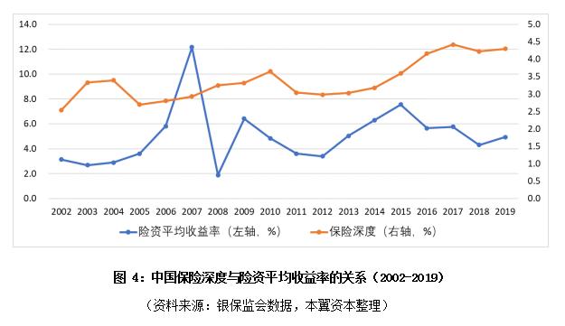 由中国2002年-2019年的保险深度数据与险资的平均收益率的关系可以看出,保险渗透率基本随着险资收益率的波动方向而波动的,并且大约滞后一年左右。2016年-2019年资本市场进入下行周期,险资平均收益率整体呈下滑趋势,保险渗透率随着行业成长具备一定的自然增速,但实际增速则滞后一年开始持续放缓,近三年稳定在4.3%左右。