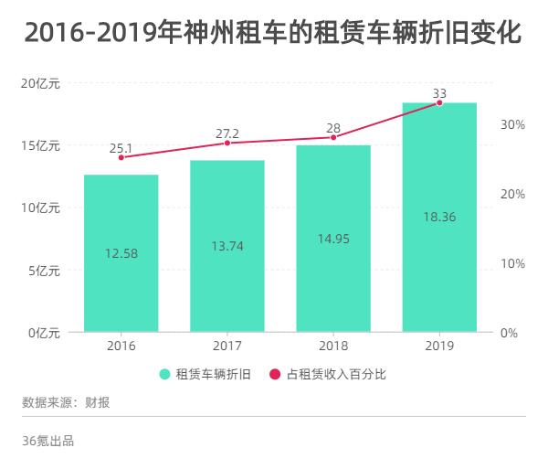 神州租车2019年度的车辆租赁折旧为18.36亿元,折旧成本占租赁收入的百分比由2018年28.0%升至2019年的33.0%。该增幅是由于,为了促进二手车的销售,大部分汽车型号(受回购协议规限的型号除外)的剩余价值估计降低。此外,汽车租赁单车日均收入下降也对其造成影响。