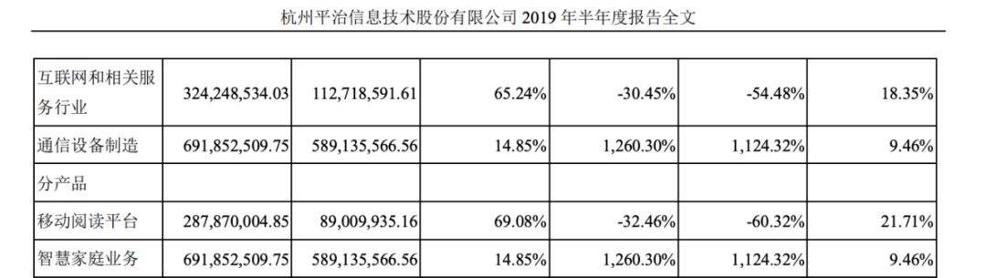 平治信息方面,2019半年报显示,来自互联网和相关服务行业和移动阅读平台的收入分别较2018年同期锐减30.45%和32.46%,财报中漂亮的营收和利润数据主要由新的智慧家庭业务支撑。