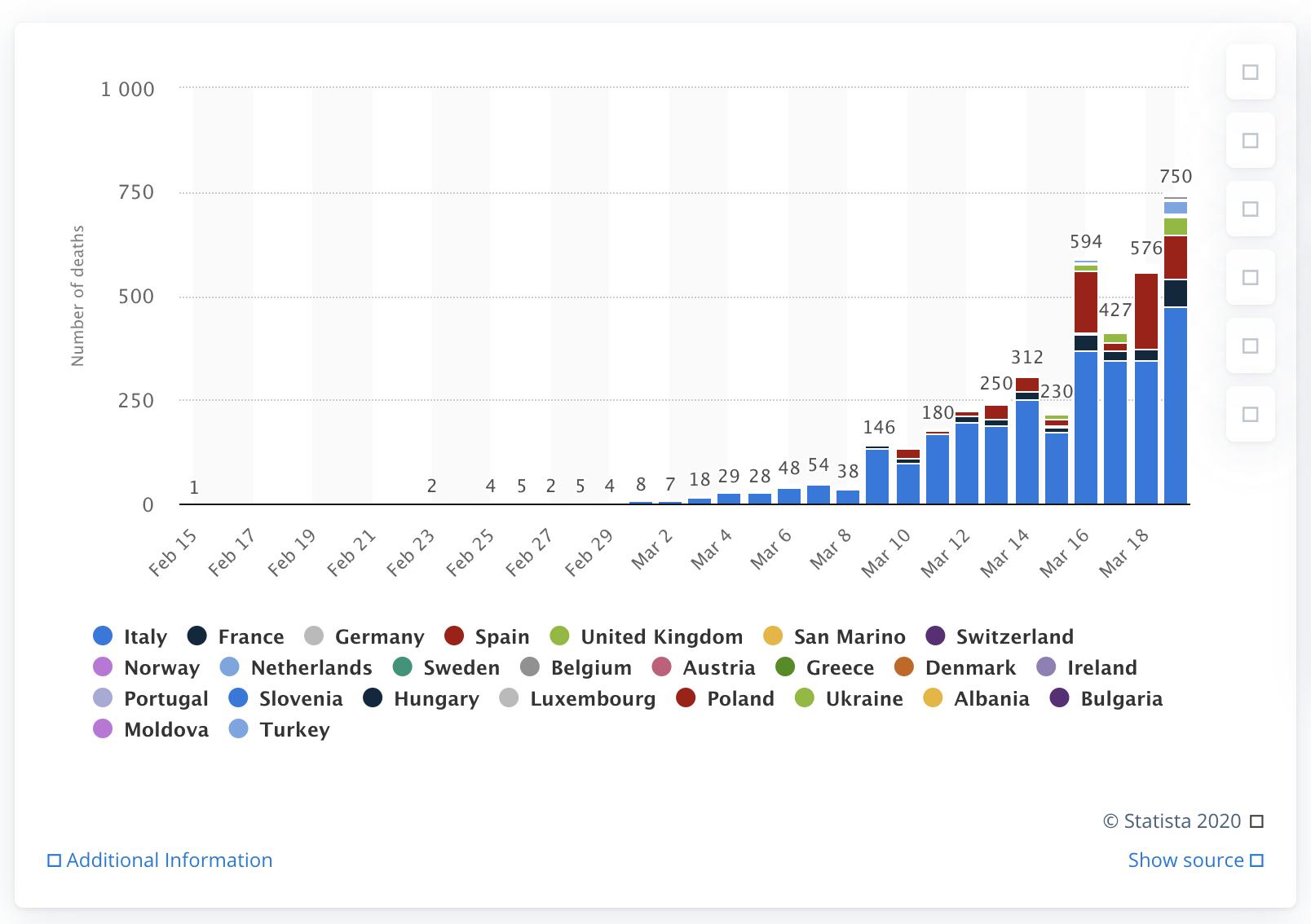 欧洲不同国家因新冠病毒而死亡的人数 图片来源:statista