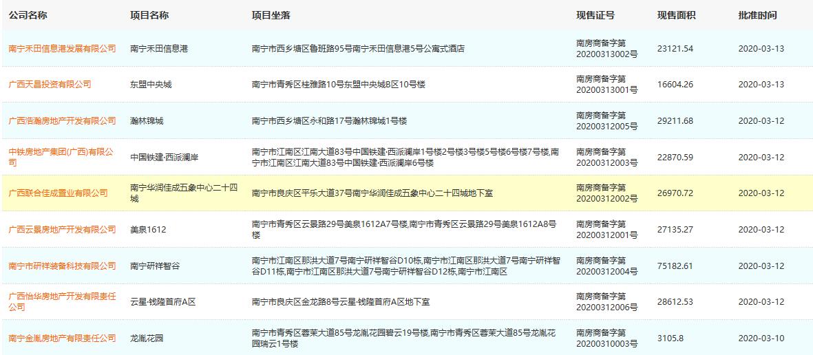 近期南宁批准的部分现售项目资料来源:南宁市住房和城乡建设局网站