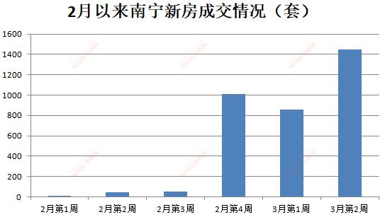 进入3月份后,南宁新房成交量继续快速上升。3月第1周(3月2日~8日),南宁商品房成交858套;3月第2周(3月9日~15日)成交1445套。