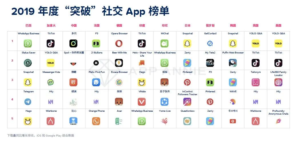 互补性和良好的商业化能力,离不开探探的旺盛的生命力。AppAnnie 发布的《移动市场报告2020》显示,2019年度“突破”社交App榜单中探探位居德国第四,印尼第三;2019年全球热门约会交友App用户支出超过22亿美元,达到2017年的2倍。其中,探探排名第6;中国用户支出排名中,探探挺进热门应用第10,陌陌位居领先应用公司第6,仅次于腾讯、百度、阿里、快手和今日头条。
