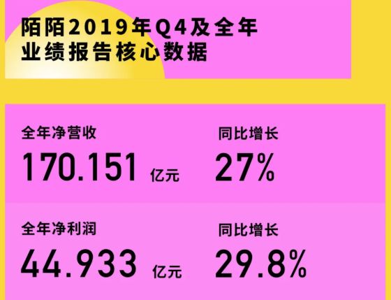 2019年全年,陌陌净营收170.151亿元(约24.441亿美元),同比增长27%。不按照美国通用会计准则计量,归属于陌陌母公司的净利润为44.933亿元(约6.454亿美元),上一年同期为34.621亿元,同比增长29.8%。