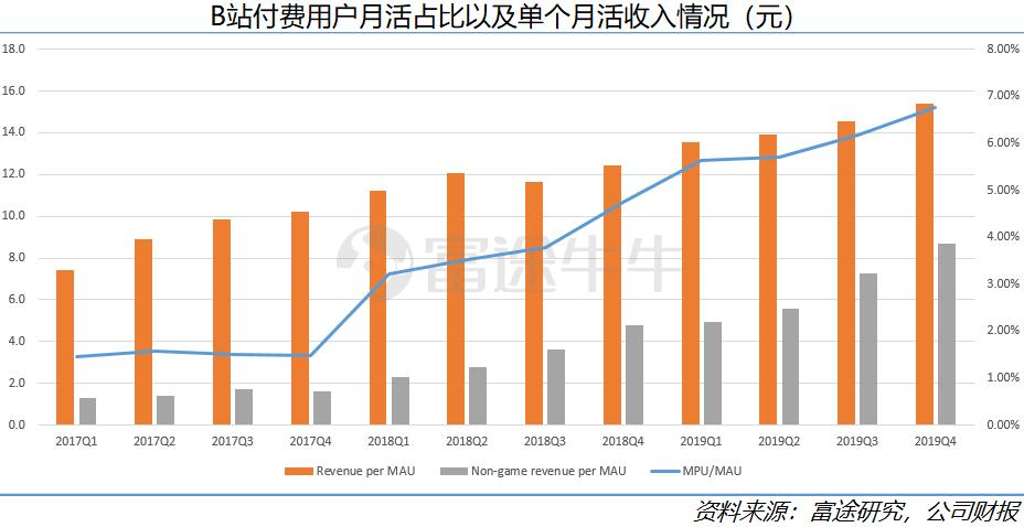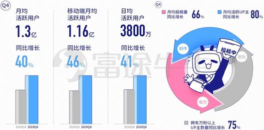 业绩的增长离不开用户,B站在积极的用户增长策略下,19年成功破圈,成果显而易见:Q4月活用户MAU达到1.3亿,日活DAU达到3800万,增速都在40%。管理层还提到有70、80后的朋友也加入到了弹幕大军。