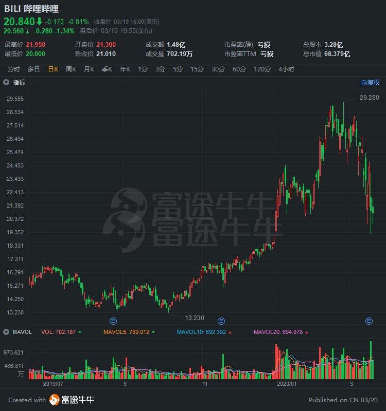 但是市场似乎一直对B站这个互联网情怀聚集地有着更好的耐心,今年1月之后,疫情催生的宅经济无疑对B站有着很好的借力。B站的股价也是不断攀升,最高股价接近30美元,市值接近100亿美元。在整体大环境的不是很理想的情况下,B站的股价表现的相对抗跌。公司股价目前为20美元以上,市值在70亿美元以上。