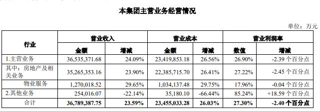 其中房地产仍然是绝对的核心。全年的房产销售金额为6308.4亿元,相关业务营业收入为 3526.5亿元,占比达95.9%。近两年大力布局的物业服务,营业收入只有 127亿元。
