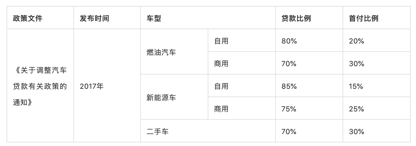 2017年,人民银行、银监会发布《关于调整汽车贷款有关政策的通知》,对2004年版的《汽车贷款管理办法》进行修订,修订后的管理办法对五种车型的贷款发放比例进行了规定。新能源汽车的首付比例整体低于传统动力汽车,同时二手车的首付比例由2004版的50%降至了30%,有利于促进新能源汽车和二手车信贷规模的增长。