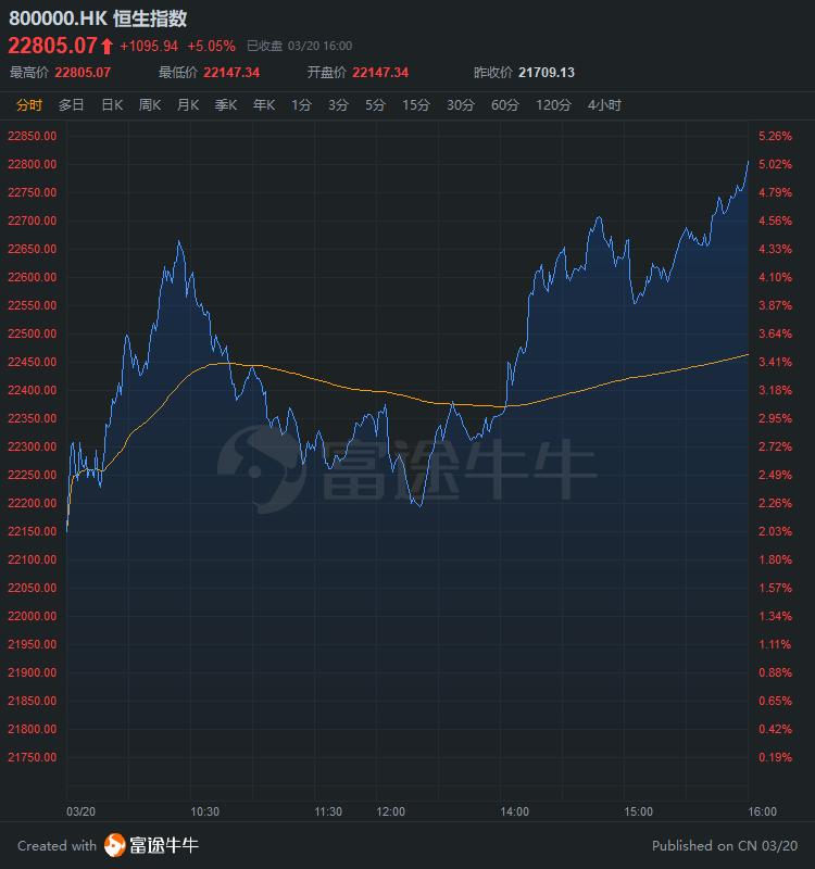 富途资讯3月20日 | 恒指午后持续发力,交投热度略有回暖,个股普遍上涨。截至收盘,恒生指数涨5.05%,报22805.07点;国企指数涨6.53%,报9118.67点。主板全天成交1712.72亿港元,较上个交易日小幅减少。