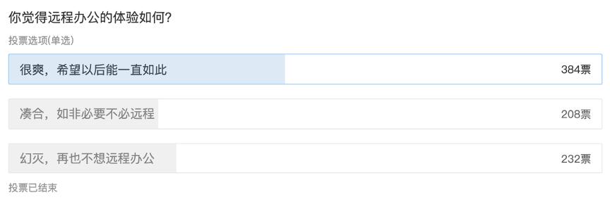 2020年发生的这次疫情,刚好是一次远程办公的模拟。3月11日左右,也就是许多人因为疫情而开始远程办公的一个月左右,微博上有一个小投票,结果如下: