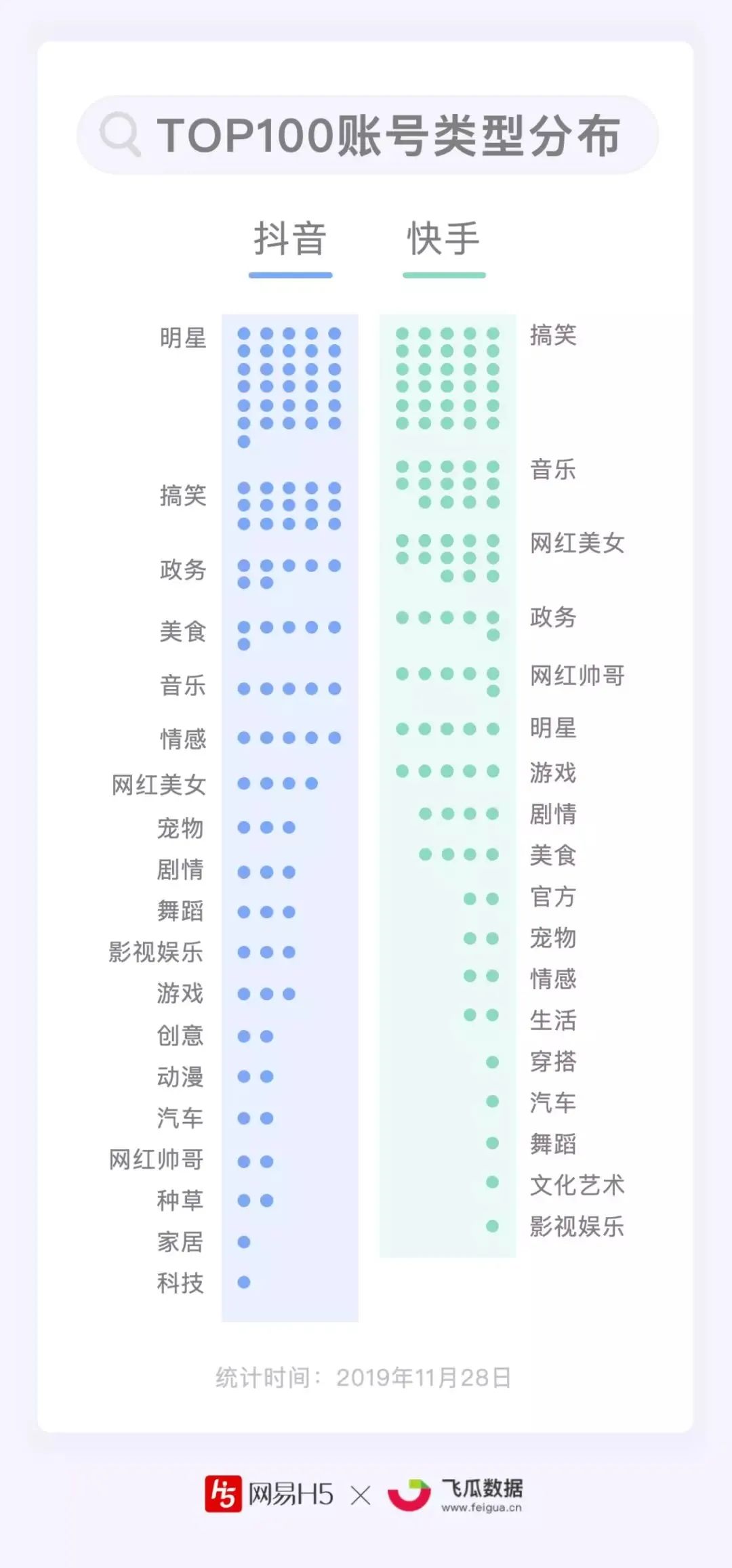 一直以来,喜剧、搞笑内容都是短视频直播平台的战略重点和流量大户。2019年12月,网易H5与飞瓜数据发布《短视频Top100账号数据报告》。报告显示,快手和抖音两个平台T0P100的账号中,搞笑类型的账号占比分别为第一和第二。