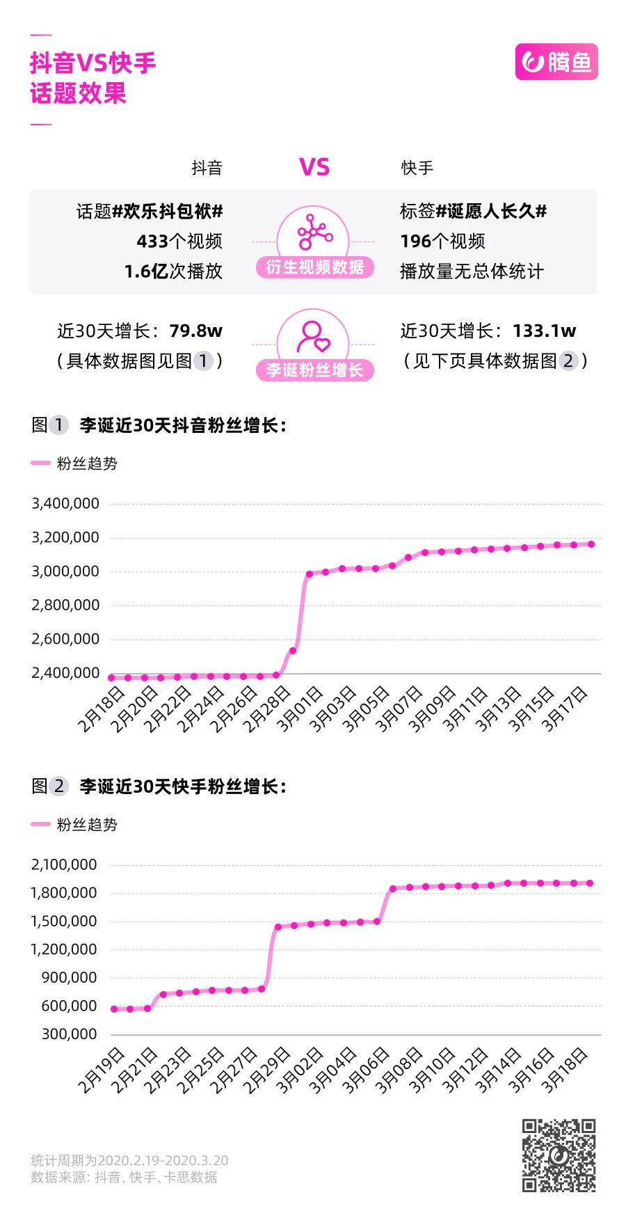 在抖音的#欢乐抖包袱#话题下,大量用户自发对直播连线进行视频再创作,不过李诞直播较少,粉丝增长一般。在快手,虽然用户自发的视频再创作有限,但李诞的四场直播以及红人“甩粉”让他在多个节点增粉明显。